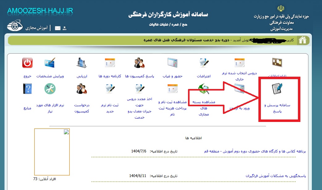 این سامانه در «میز کاربری» فراگیران سامانه آموزش خادمان فرهنگی قرار گرفته و مخاطبان محترم می توانند با کلیک روی آن، به «سامانه پرسش و پاسخ» دسترسی داشته باشند.